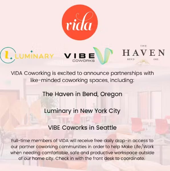 VIDA Coworking is excited to announce partnerships with like-minded coworking spaces across the country, including: The Haven in Bend, Oregon Luminary in New York City VIBE Coworks in Seattle. Full-time members of VIDA will receive free daily drop-in access to these partner coworking communities in order to help Make Life/Work when needing comfortable, safe and productive…